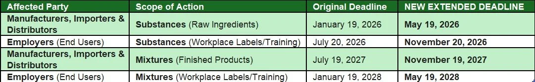 The new OSHA HCS 2024 compliance deadline for substances has been officially extended to May 19, 2026, as per the January 15 Federal Register notice.
